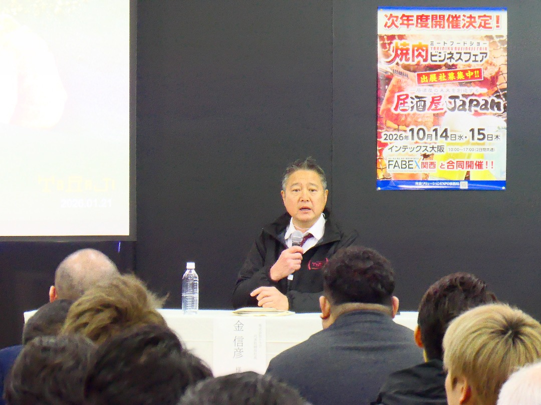 セミナー会場では、当協会の会長の株式会社トラジの金信彦社長によるいつもの【トラジの挑戦】で、30年目を迎えたトラジの創業から今日に至るまでを失敗や成功体験を紹介、これからのトラジの戦略や今後について講演しました。2日目は、当協会の名誉会長、株式会社叙々苑 新井泰道会長と協会理事で株式会社日本食糧新聞社の岡安常務によるセッションで、「焼肉の王道を探求する心得」と題し新井会長との掛け合いでのひきしまった内容で高評価の講演となりました。いずれの講演も、立見が出る程の来場者で賑わっていました。。