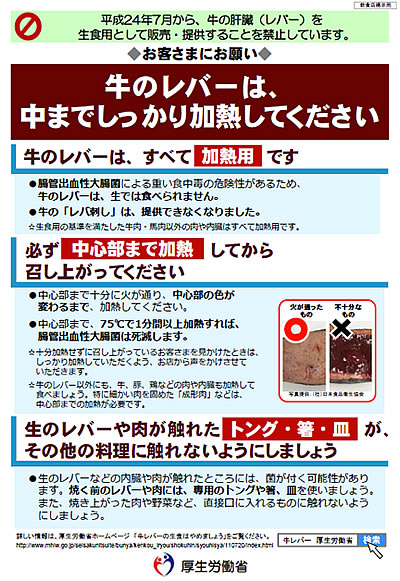 牛肝臓生食の取扱いについては、既にお知らせしていますが、6月25日、厚生労働省告示が官報掲載され「牛肝臓の規格基準」が、7月1日から施行されます。