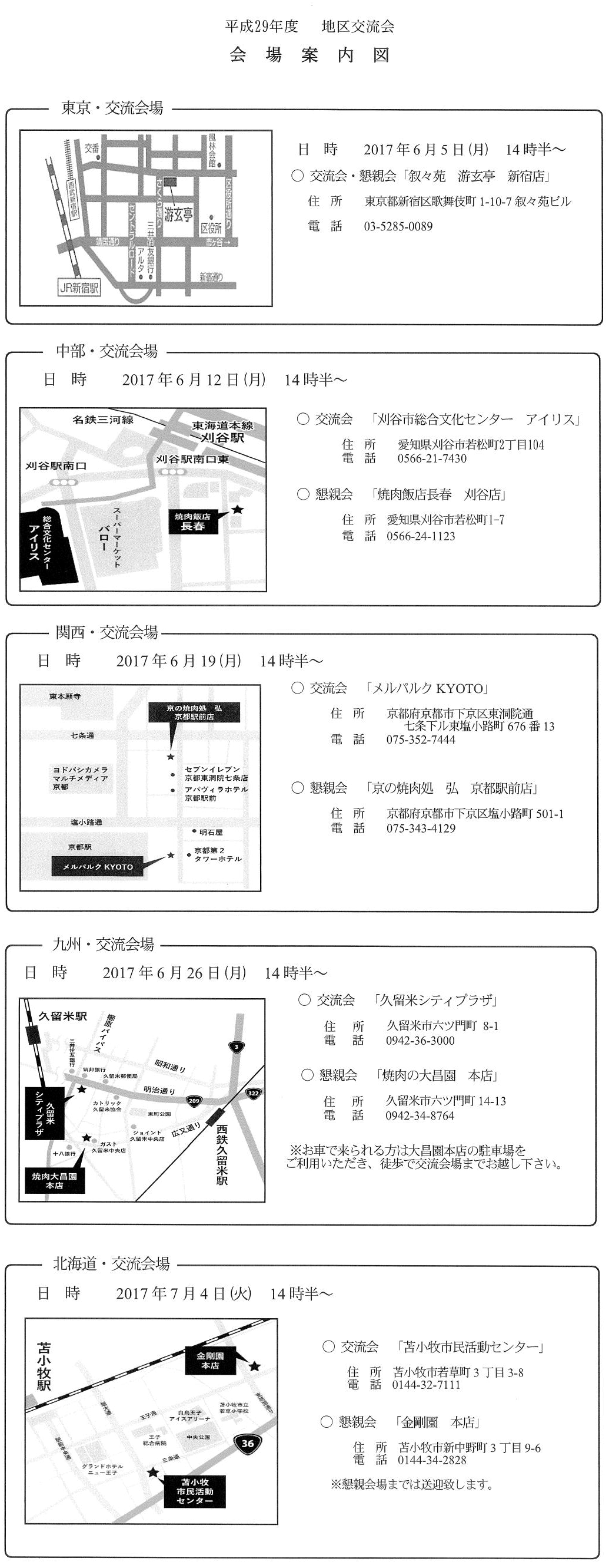 | 東海 北陸 | 2017年6月12日(月) 14:30~ | (交流会場) 刈谷市総合文化センター (アイリス) (懇親会場) 焼肉飯店 長春 | 〒448-0858 愛知県刈谷市若松町2-104 TEL: 0566-21-7430 GoogleMap 〒448-0858 愛知県刈谷市若松町1-7 TEL:0566-24-1123 GoogleMap |