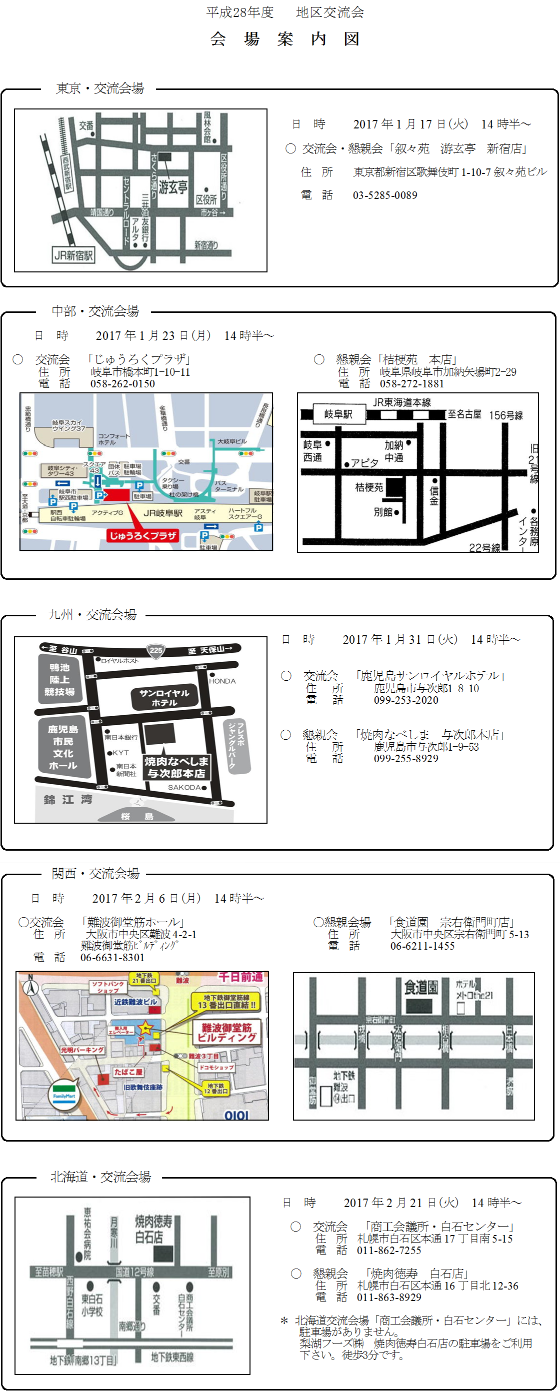 | 東北 関東 甲信越 | 1月17日(火) 交流会14:30~ 懇親会17:00~ | (交流会場・懇親会場) 叙々苑・游玄亭新宿店 | 東京都新宿区歌舞伎町1-10-7 叙々苑ビル3F TEL: 03-5285-0089 GoogleMap |
