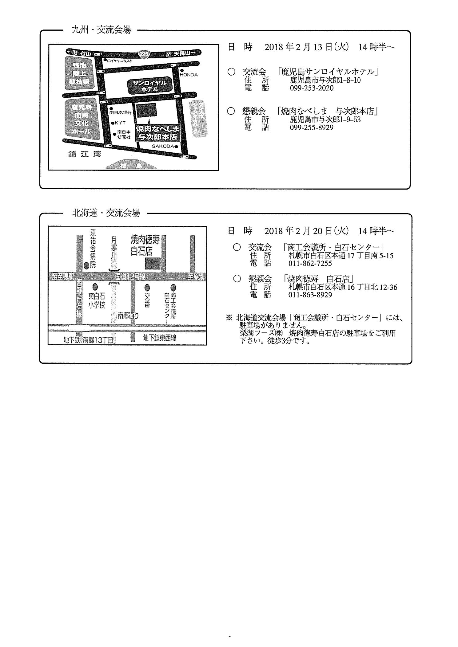 北海道 | 2月20日(火) 交流会14:30~ 懇親会17:00~ | (交流会場) 札幌商工会議所 白石商工センター会議室 (懇親会場) 焼肉徳寿・白石店 | 札幌市白石区本通南17丁目南5-15 TEL:011-862-7255 GoogleMap 札幌市白石区本通16丁目北12-36 TEL:011-863-8929 GoogleMap |