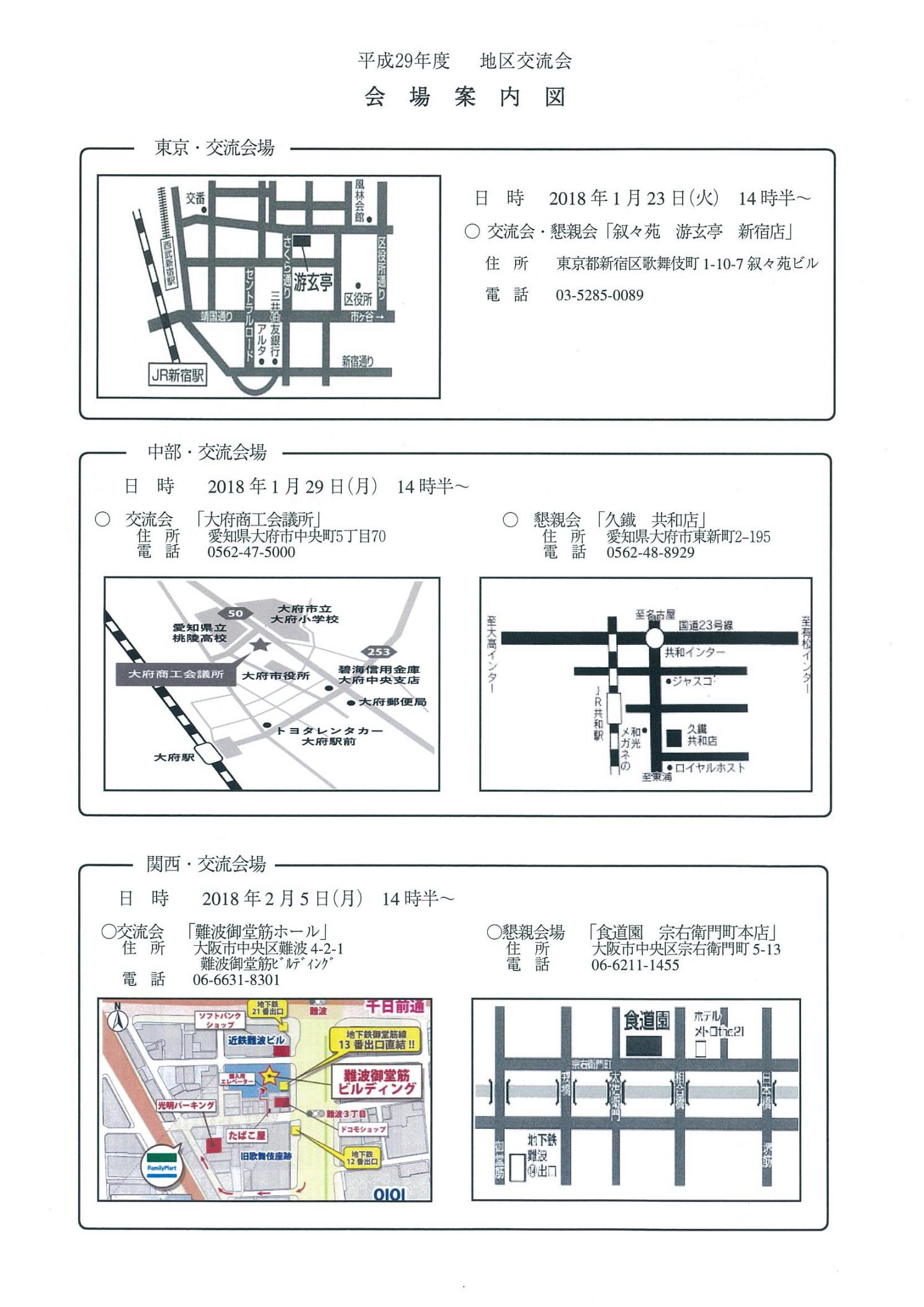 | 東海 北陸 | 1月29日(月) 交流会14:30~ 懇親会17:00~ | (交流会場) 大府商工会議所 (懇親会場) 焼肉菜包 久鐡・共和店 | 愛知県大府市中央町5-70 TEL: 0562-47-5000 GoogleMap 愛知県大府市東新町2-195 TEL: 0562-48-8929 GoogleMap |